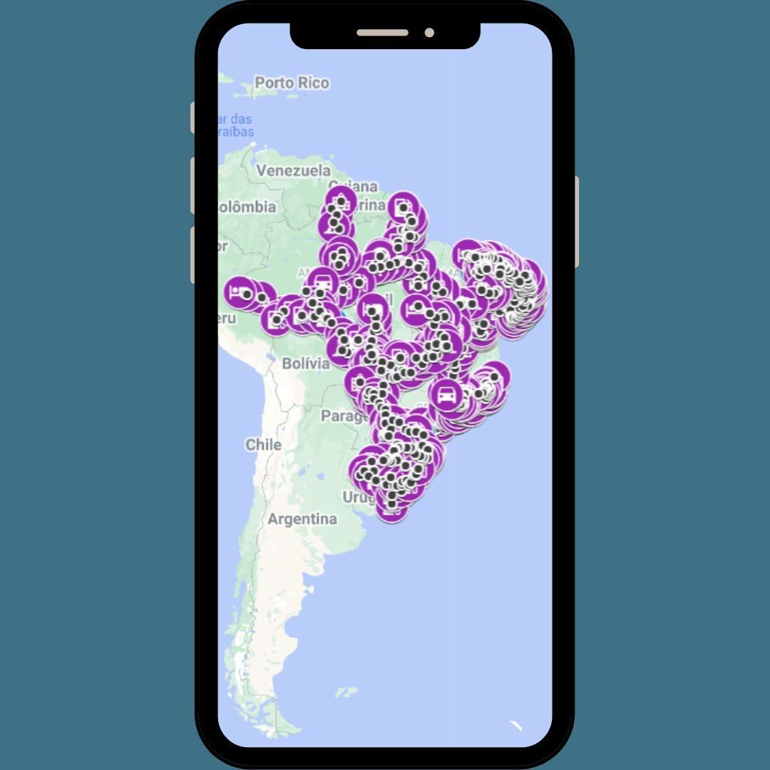 Mapa com todas as cidades visitadas na viagem (na ordem do roteiro), locais seguros para pernoitar e pontos com chuveiros (muitos em postos de combustível, mas também em rodoviárias e ginásios).